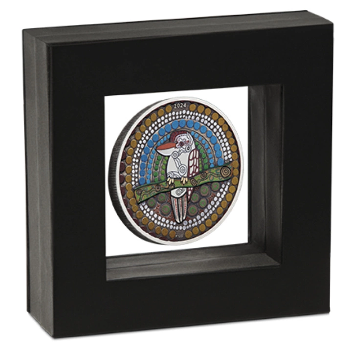 Moneta kolekcjonerska Kookaburra Kaa-Kaa kolorowany 2 uncje Srebra 2024 Antiqued Coin prezentuje kangura inspirowanego kulturą Aborygenów. Egzemplarz został zaprojektowany przez artystę Kevina Bynder'a, który pochodzi z plemienia Whadjuk-Yuet-Ballardong.