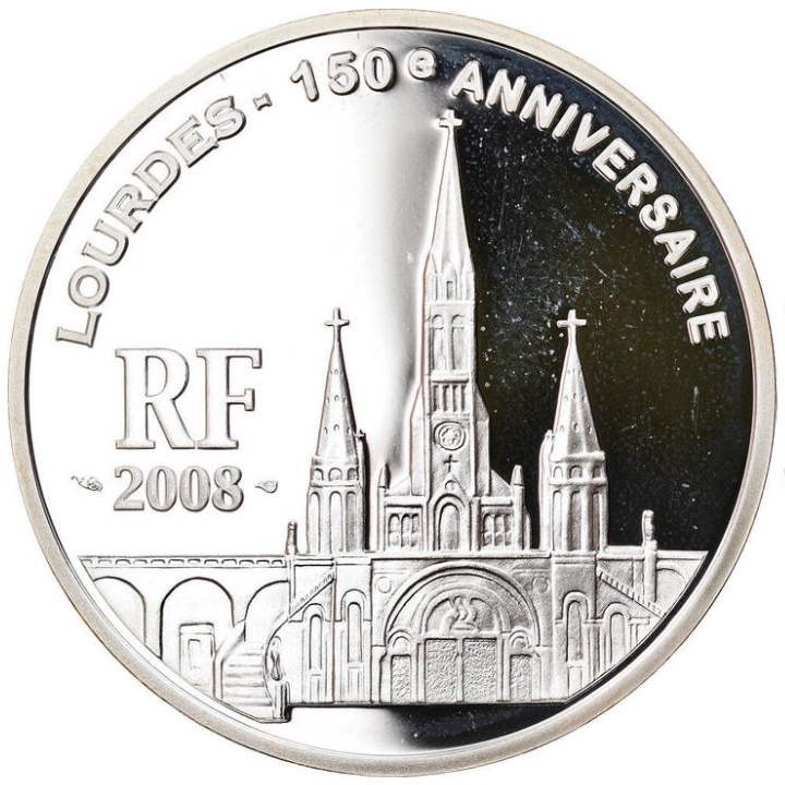 Francja: Lourdes 150e Anniversaire 1,5 Euro Srebro 2008 to pamiątkowa moneta wybita z okazji 150. rocznicy objawień maryjnych w Lourdes, które miały miejsce w 1858 roku.