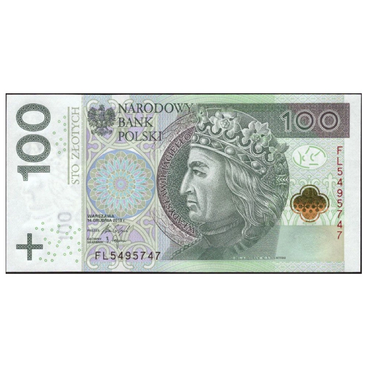 Banknot o nominale 100 złotych to zaawansowany środek płatniczy, wyposażony w liczne zabezpieczenia technologiczne. Jego wymiary to 138 x 69 mm, a design nawiązuje do postaci króla Władysława II Jagiełły, symbolizując męstwo i historyczne zwycięstwa Polski.