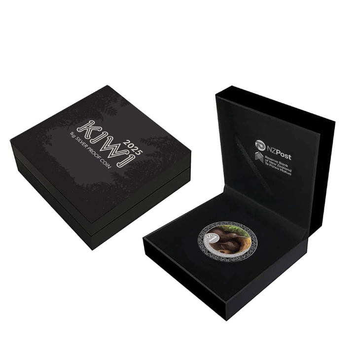Kolekcjonerski numizmat Kiwi kolorowany 1 uncja Srebra 2025 Proof to niezwykle ceniona moneta będąca częścią emitowanej od 2004 roku limitowanej serii Kiwi. Produkt z 2025 roku przedstawia parę kiwi z gatunku - "Apteryx rowi "wraz z ich jajem, co odzwierciedla unikalne cechy tego gatunku, jak współdzielenie opieki nad potomstwem przez samca i samicę. Pisklęta często pozostają w rodzinnej grupie przez kilka lat. Moneta ozdobiona jest również tradycyjnym wzorem kowhaiwhai, podkreślającym związek ludu iwi z rowi. Wzór ten został podarowany przez Fayne'a Robinsona z Te Rūnanga o Makaawhio.