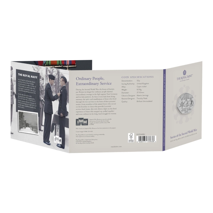 The Stories of The Second World War 50p Miedzionikiel 2025 to moneta upamiętniająca bohaterstwo i determinację ludzi, którzy walczyli i przeżyli jeden z najtrudniejszych okresów w historii. Druga Wojna Światowa stanowiła egzystencjalne zagrożenie dla Wielkiej Brytanii, jednak zarówno żołnierze na froncie, jak i cywile na zapleczu, wykazali niezwykłą odwagę w walce z nazistowskimi Niemcami i ich sojusznikami. Moneta ta oddaje hołd ich historii i poświęceniu, podkreślając znaczenie osobistych opowieści w zachowaniu pamięci o wojnie.
