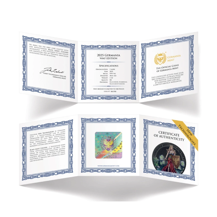 Srebrna moneta została wybita z czystego kruszcu próby Ag.9999, o wadze 1 uncji trojańskiej oraz średnicy liczącej 38,61 mm. Nakład monety jest ograniczony do 500 sztuk. Moneta została wykonana z wykorzystaniem technologii Black Light Colours, co daje fluorescencyjny efekt pod światłem UV. Walor został stworzony przez Germania Mint i umieszczony w oryginalnym kapslu wraz z certyfikatem autentyczności.