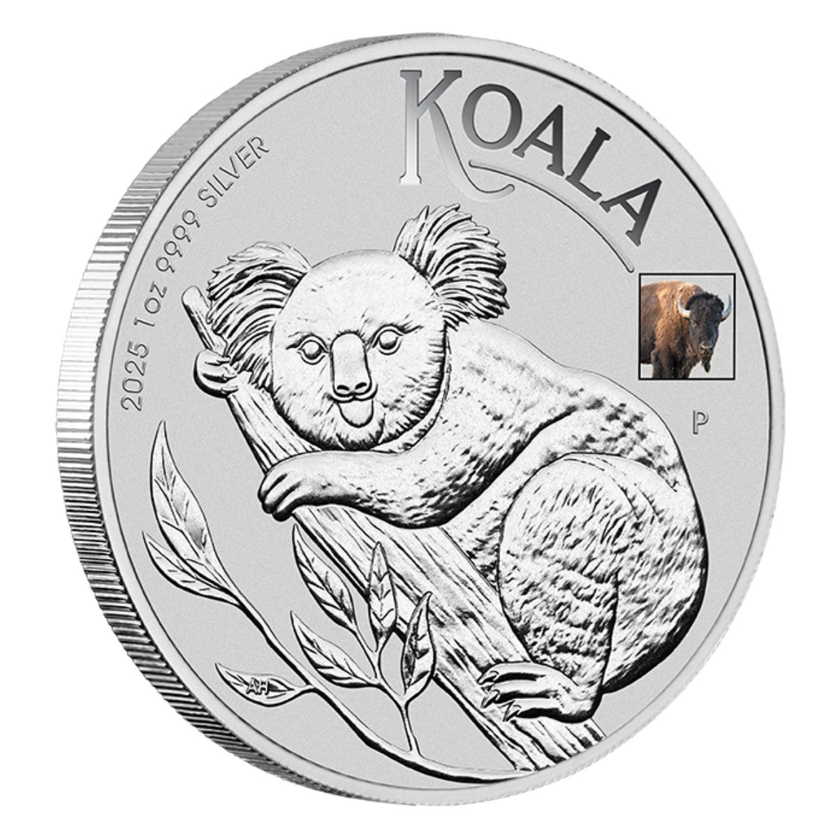 Rewers monety przedstawia uroczą koalę obejmującą pień drzewa wśród liści eukaliptusa. Kompozycję uzupełnia kolorowany znak privy mark z wizerunkiem bizona – potężnego ssaka i ikony dzikiej przyrody Ameryki Północnej. Na rewersie znajdują się również napisy: „KOALA”, znak mennicy Perth Mint „P”, rok emisji oraz waga i czystość kruszcu.