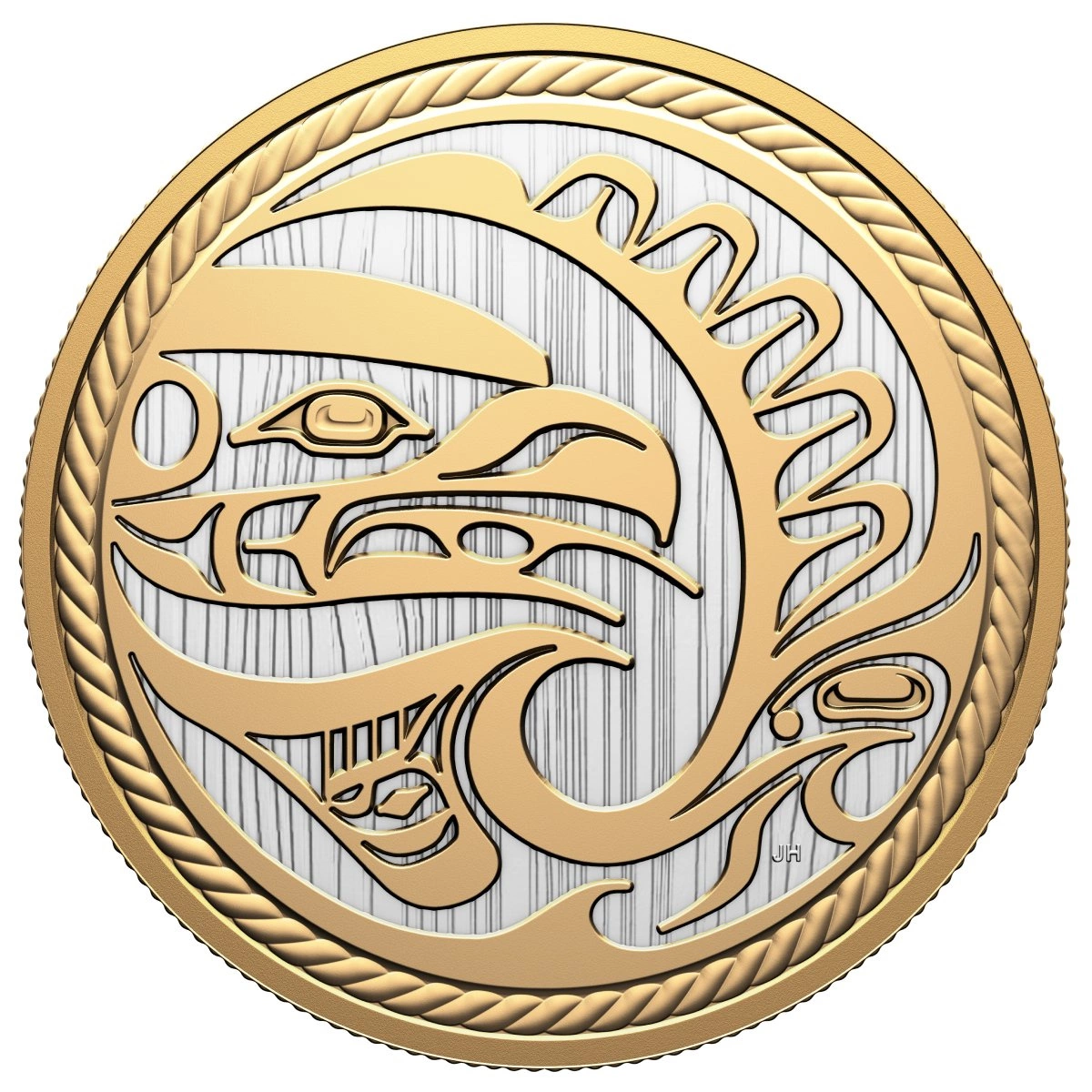Rewers przedstawia ręcznie rzeźbiony panel w stylu formline autorstwa artysty Jasona Henry’ego Hunta, z orłem i orką jako głównymi motywami. Żółte złocenie podkreśla płynne linie i owalne kształty, a całość otacza dekoracyjna rama w formie skręconego sznura z cedru.