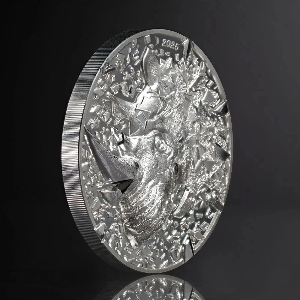 Moneta wykonana została z 3 uncji srebra o próbie 0,9999 i ma średnicę 50 mm. Wybita w jakości Proof z zastosowaniem technologii smartminting, oferuje niesamowitą głębię i ostrość detali. Wizerunek nosorożca został precyzyjnie odwzorowany, a artystyczne tło rozciągające się do krawędzi monety podkreśla ekspresję kompozycji. Limitacja emisji do 999 egzemplarzy czyni ją pożądaną pozycją wśród kolekcjonerów.