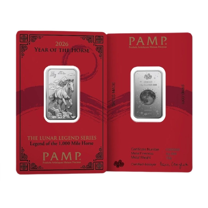 Sztabka PAMP: Lunar Legends – 1,000 Mile Horse 10 gramów Srebra 2026 to niezwykły walor z serii Lunar Legends, która przybliża mity i podania związane z chińskim zodiakiem. W 2026 roku przypada Rok Konia, a wybity motyw przedstawia legendarnego wierzchowca 1,000 Mile Horse – istotę z chińskiego folkloru, zdolną w jeden dzień pokonać tysiąc li (około jednej trzeciej mili). Tylko Bo Le, słynny znawca koni, potrafił poskromić jego moc i odkryć pełen potencjał zwierzęcia. Symbolizuje on ludzi o ukrytych zdolnościach, które czekają na odkrycie.