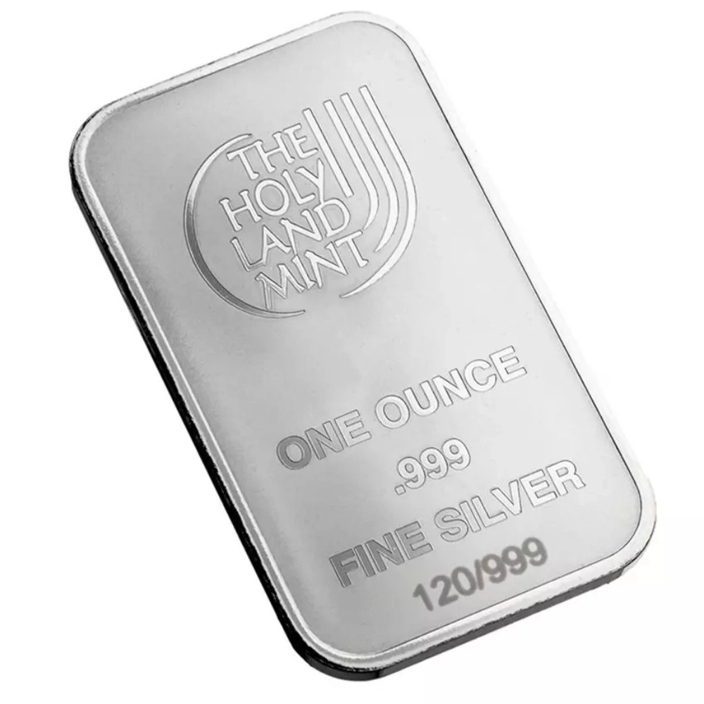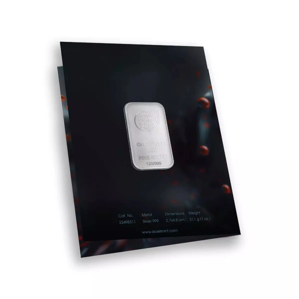 Rewers zawiera logo The Holy Land Mint, dane dotyczące wagi, próby srebra oraz indywidualny numer sztabki, łącząc walory inwestycyjne z precyzyjnym wykonaniem menniczym i wartością estetyczną.