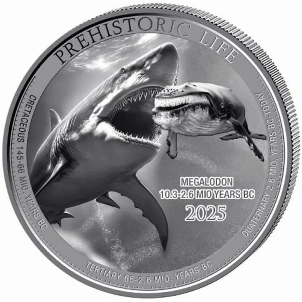 Congo: Prehistoric Life - Megalodon 1 uncja Srebra 2025 to wyjątkowa propozycja dla kolekcjonerów oraz inwestorów, którzy cenią unikalne emisje inspirowane historią naturalną. Seria Prehistoric Life przenosi nas do epoki prehistorycznej, prezentując monumentalne stworzenia, jakie niegdyś zamieszkiwały naszą planetę. Motyw tej edycji poświęcony jest Megalodonowi – prehistorycznemu rekinowi, który jako drapieżnik szczytowy dominował w oceanach miliony lat temu. Jego legendarna siła i rozmiary sprawiają, że stał się ikoną dawnego świata przyrody.