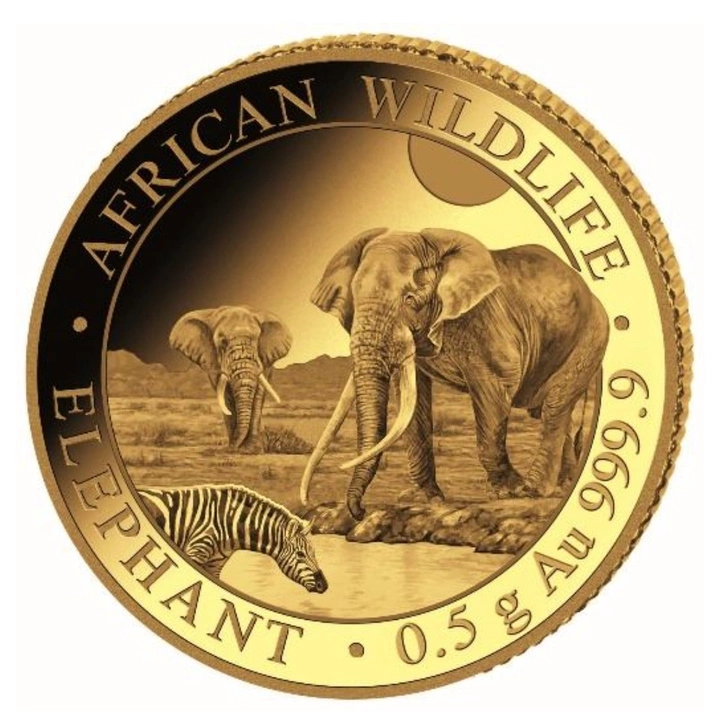 Moneta waży 0,5 grama, ma średnicę 16 mm i grubość dostosowaną do zachowania harmonijnych proporcji. Za produkcję odpowiada Bawarska Mennica Państwowa (Bayerisches Hauptmünzamt) z Monachium, której tradycja bicia monet sięga XII wieku, a renomowana marka gwarantuje niezmiennie wysoką jakość i precyzję wykonania. Seria African Wildlife debiutowała w 1999 roku pod patronatem Zambii, zaś od 2004 roku oficjalnym emitentem jest Republika Somalii. Każda edycja przedstawia inne ujęcie słonia afrykańskiego – symbolu siły, mądrości i godności – co dodatkowo podkreśla unikalny charakter każdego nominału.