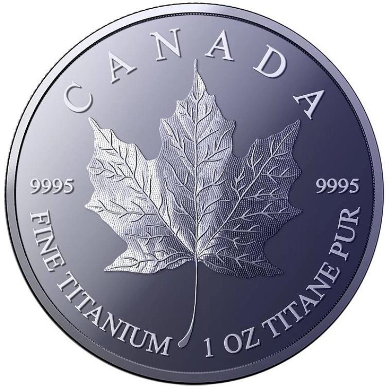Rewers: charakterystyczny liść klonowy z napisem „CANADA” oraz oznaczeniem wagi i próby tytanu – harmonijna i czytelna kompozycja.