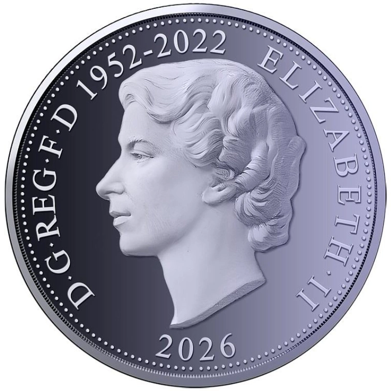 Awers: portret królowej Elżbiety II otoczony jej imieniem, królewską inskrypcją oraz datą panowania 1952–2022; na dole wybity rok emisji – 2026.