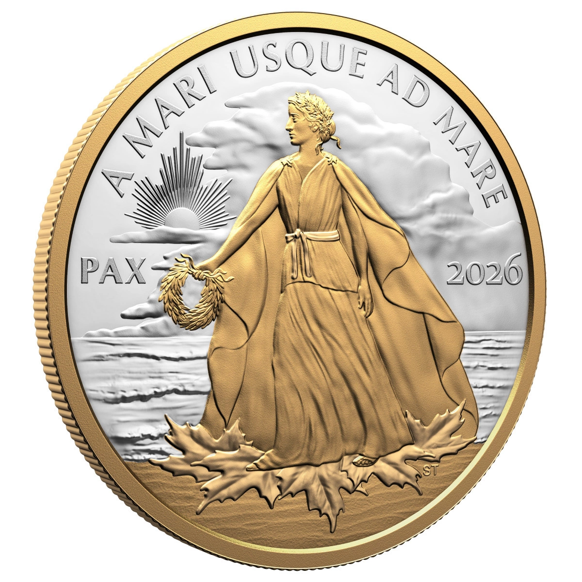Rewers: pozłacana Lady Peace stojąca na ziemi, otoczona inskrypcjami A MARI USQUE AD MARE u góry, PAX po lewej i datą 2026 po prawej. Projekt autorstwa Susan Taylor, emerytowanej grawerki Royal Canadian Mint, zachwyca połączeniem matowych i lustrzanych powierzchni.