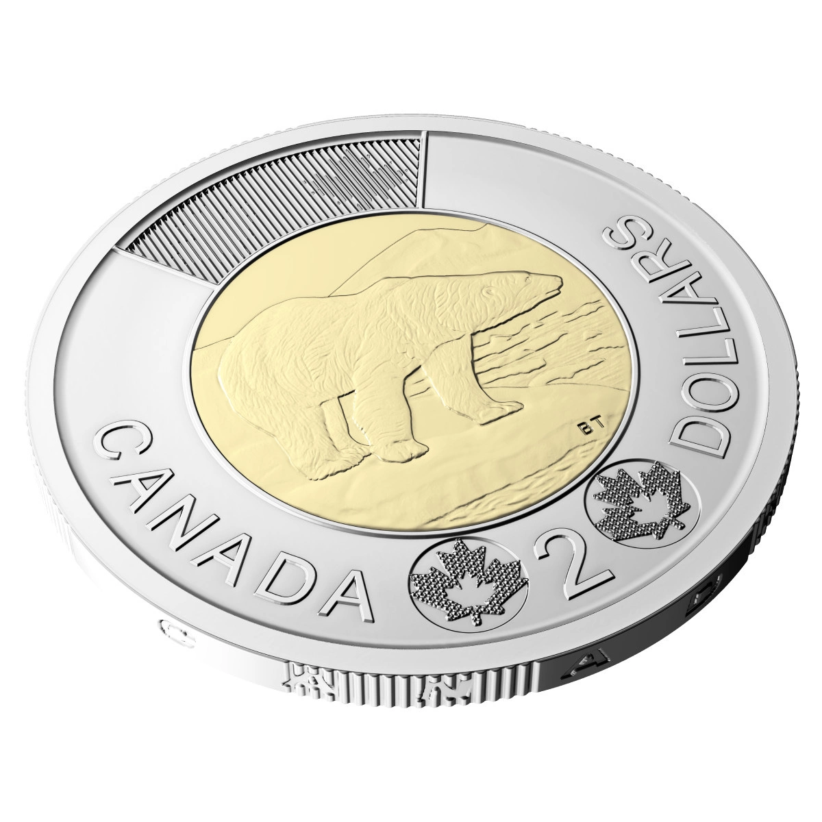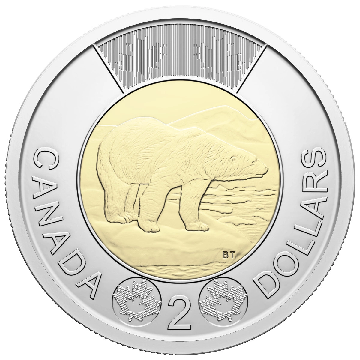 Rewers przedstawia niedźwiedzia polarnego w naturalnym krajobrazie Arktyki, wraz z napisem „Canada” i wartością nominalną – 2 dolary.