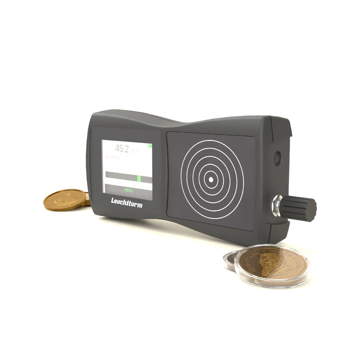 Leuchtturm – Tester metali szlachetnych AurumXpert to zaawansowane technologicznie urządzenie, które umożliwia szybkie i bezinwazyjne sprawdzanie autentyczności złota, srebra oraz innych metali szlachetnych. Dzięki możliwości badania przedmiotów bez konieczności ich rozpakowywania – przez folie, kapsuły czy opakowania typu blister – stanowi idealne narzędzie dla profesjonalistów pracujących z monetami i sztabkami o wadze od ¼ do około 2 uncji.*