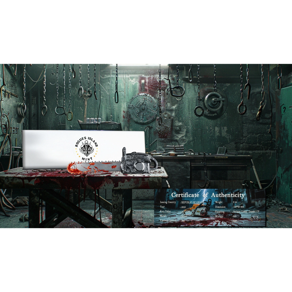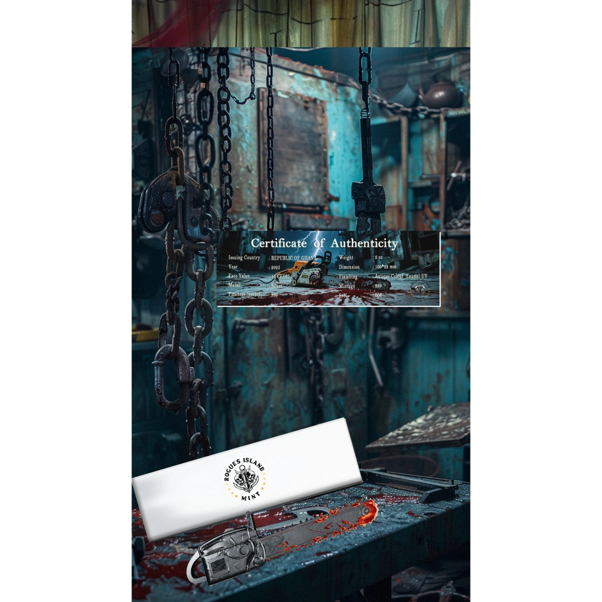 Ghana: Bloody Chainsaw kolorowany 2 uncje Srebra 2025 Antiqued Shaped Coin to niecodzienna moneta kolekcjonerska, wybita w formie zakrwawionej piły spalinowej. Zawiera 2 uncje czystego srebra próby 999, a jej wykończenie w stylu antycznym oraz intensywna aplikacja UV tworzą wyrazisty, realistyczny efekt.