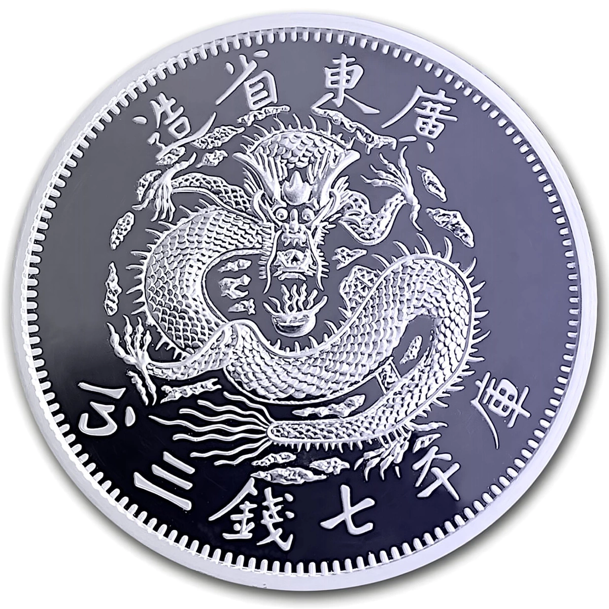 Awers zawiera napisy „Kwang Tung Province”, chińskie znaki oraz dane techniczne: wagę, rodzaj metalu i próbę, co stanowi odniesienie do dawnych emisji z mennicy Kwang Tung. Okrągła forma i detale wykonania sprawiają, że produkt będzie cennym dodatkiem do kolekcji i alternatywną formą inwestycji w niestandardowe metale.
