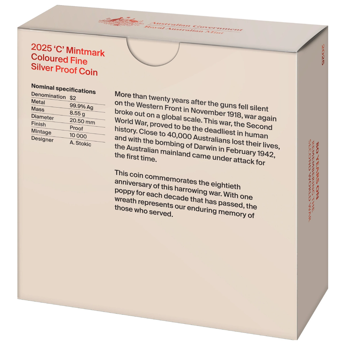 Moneta celebruje osiem dekad, które upłynęły od zakończenia konfliktu. Na jej rewersie znalazł się symboliczny wieniec pamięci z ośmiu czerwonych maków – kwiatów, które w Australii i krajach Wspólnoty Narodów niezmiennie oznaczają pamięć o ofiarach wojny. W centrum wieńca widnieje znak menniczy „C”, wskazujący na Canberrę jako miejsce bicia monety. Kolorowe akcenty czerwieni nadają projektowi szczególnie emocjonalny wydźwięk.