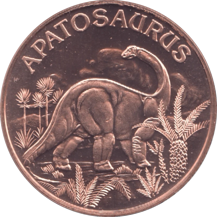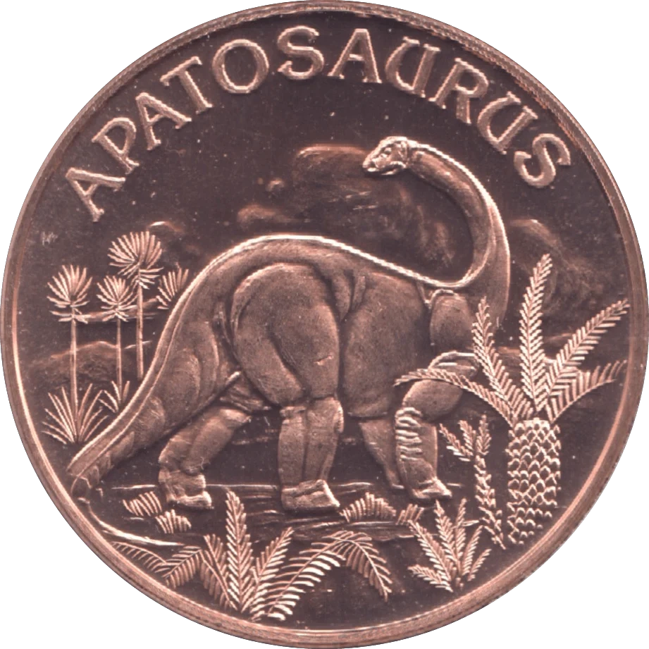 Rewers ukazuje majestatycznego Apatosaurusa w jego naturalnym otoczeniu, z długą szyją wyciągniętą ku roślinności; nazwa gatunku „APATOSAURUS” biegnie wzdłuż górnej krawędzi medalu.