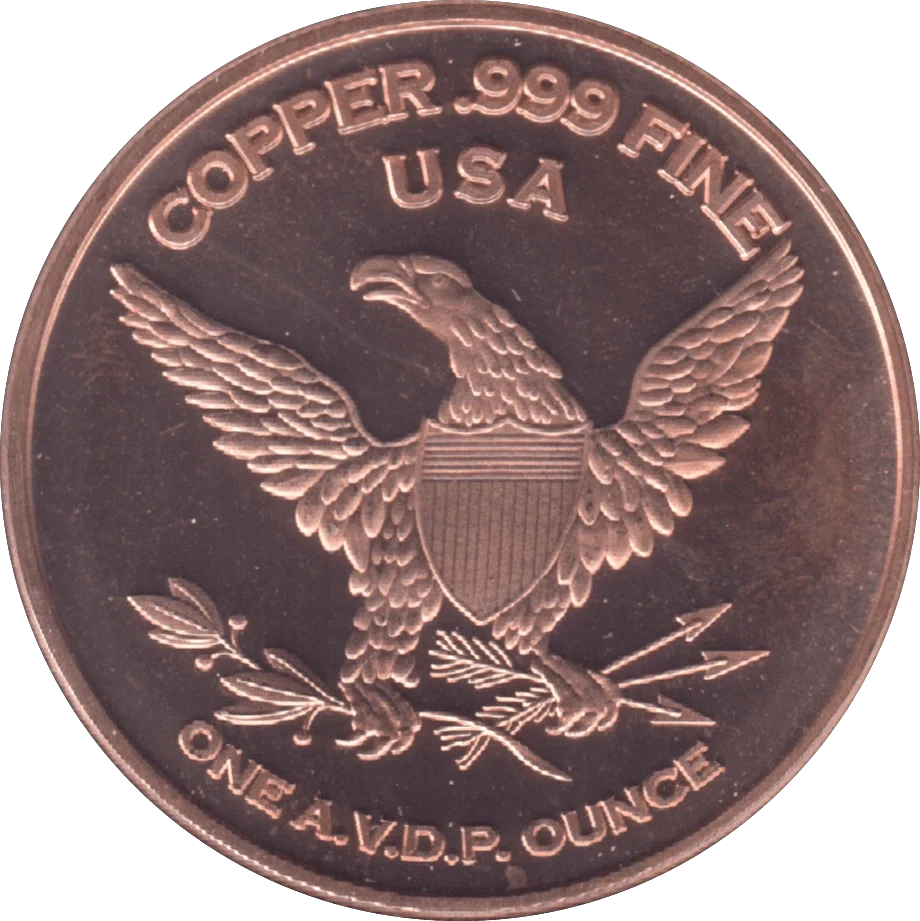 Awers zdobi tradycyjny orzeł z szeroko rozpostartymi skrzydłami i tarczą na piersi, trzymający w szponach gałązkę oliwną oraz strzały – znaki pokoju i siły. Towarzyszą mu napisy „COPPER .999 FINE”, „USA” oraz „ONE A.V.D.P. OUNCE”, które potwierdzają próbę miedzi i wagę kruszcu.
