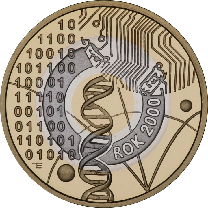 Rok 2000 – Przełom Tysiącleci 200 zł Złoto 2000 Proof to wyjątkowa moneta kolekcjonerska, wprowadzona do obiegu 16 lutego 2000 roku z okazji rozpoczęcia nowego milenium. Była to pierwsza w historii Narodowego Banku Polskiego emisja łącząca trzy różne materiały – złoto i srebro – co od momentu debiutu wyróżniało ją na światowej scenie numizmatycznej pod względem innowacyjnych rozwiązań menniczych. W tym samym roku podczas międzynarodowego kongresu dyrektorów mennic w Canberze przyznano jej prestiżowy tytuł „Najbardziej zaawansowanej technicznie złotej monety kolekcjonerskiej”.