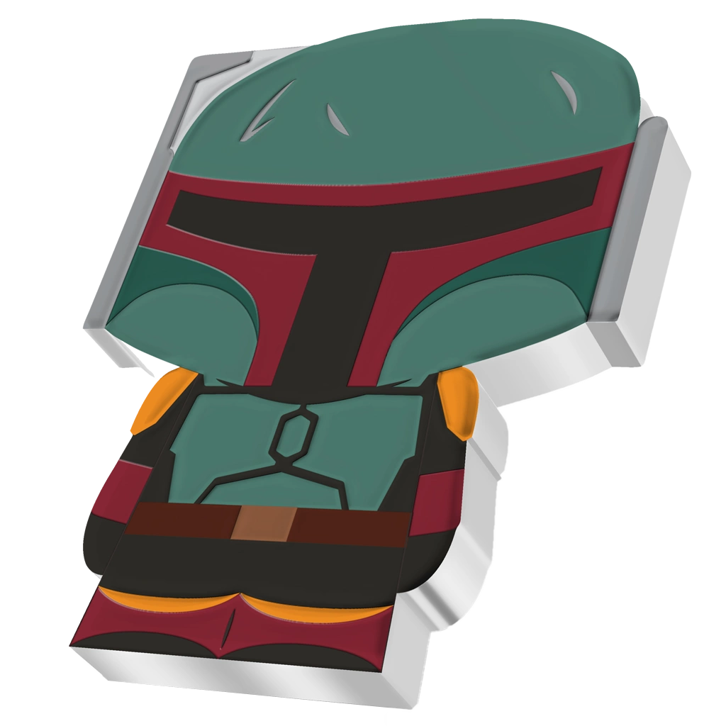 Rewers ukazuje Bobę Fetta w stylu Chibi, z wyraźnie przerysowanymi proporcjami i charakterystyczną ekspresją, podkreślając wyjątkowość projektu oraz atrakcyjność monety dla fanów i kolekcjonerów.