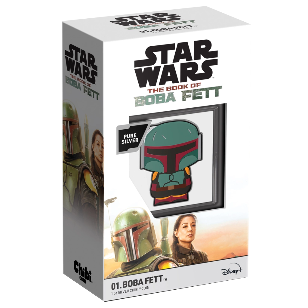 Niue: Star Wars - Boba Fett Chibi Coin kolorowany 1 uncja Srebra 2022 Proof to kolekcjonerska moneta z linii Star Wars – Chibi Coins, prezentująca Bobę Fetta w konwencji chibi, z powiększoną głową i skróconymi proporcjami sylwetki, co nadaje wizerunkowi wdzięku i humoru. Egzemplarz wybity został z jednej uncji srebra próby 999 w jakości proof, a każda sztuka trafia do nabywcy w oryginalnym pudełku wraz z certyfikatem autentyczności.