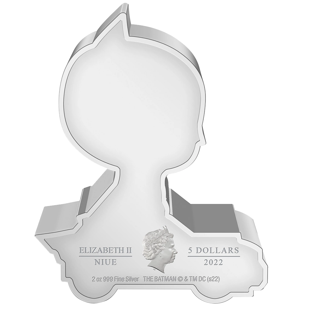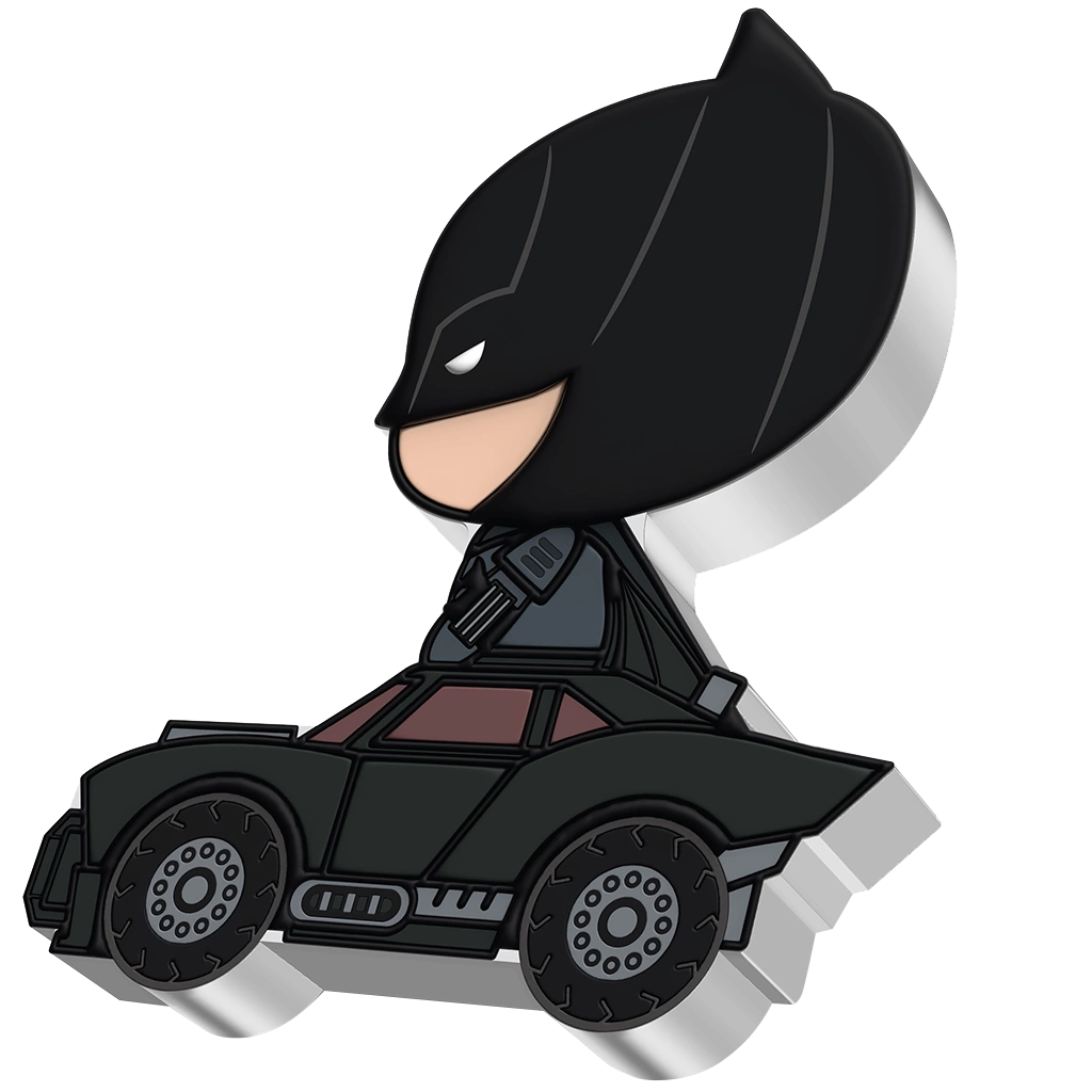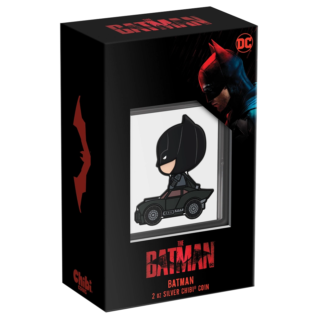 Niue: The Batman - Batman Day Chibi Coin kolorowany 2 uncja Srebra 2022 Proof to kolorowana moneta z serii Chibi inspirowanej filmem „The Batman”, ukazująca kultowego bohatera w charakterystycznej, żartobliwej estetyce chibi. W projekcie zaprezentowano Batmana za kierownicą Batmobile’a, co nadaje całości dynamiki, efektowności i wyrazistego charakteru. Taka stylizacja przypadnie do gustu zarówno fanom komiksów DC, jak i kolekcjonerom poszukującym nieszablonowych pozycji.