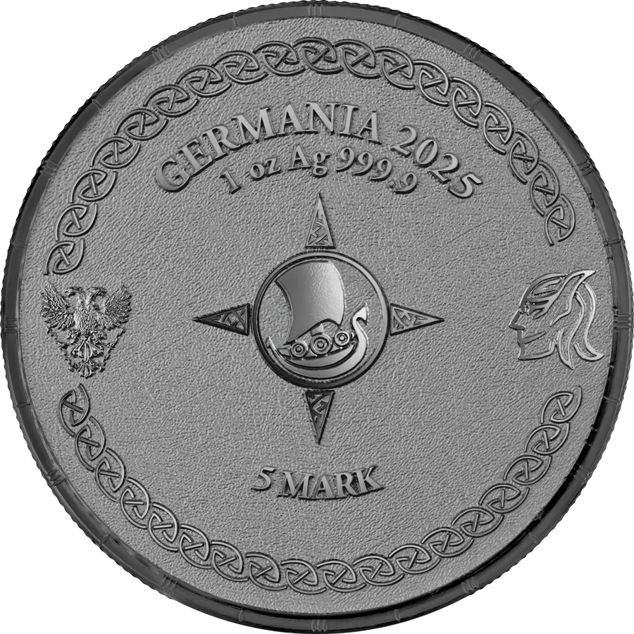 Rewers prezentuje charakterystyczny dla Germania Mint motyw: stylizowaną łódź oraz dwugłowego orła, symbolizującego potęgę, czujność i tradycję menniczą producenta.