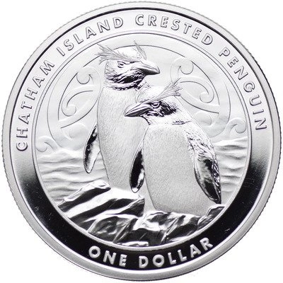 Rewers monety ukazuje parę pingwinów czubatych stojących na skale na tle oceanu. W tle kompozycji widoczny jest nowozelandzki motyw „koru”, nawiązujący do kształtu zwiniętego liścia paproci. Całość dopełnia napis „Chatman Island Crested Penguin”. Autorem projektu rewersu jest Dave Burkle.