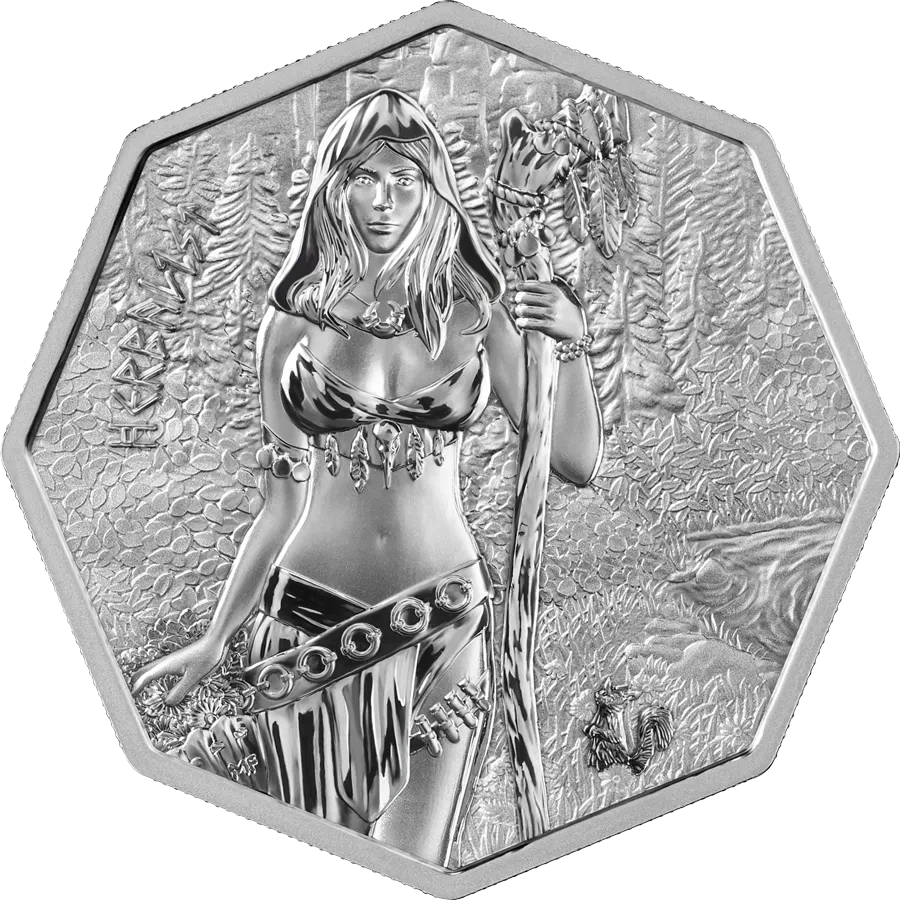 Witchcraft - Herbalist 1 uncja Srebra 2025 to druga postać w wyjątkowej serii Witchcraft. Emisja 2025 Witchcraft: Herbalist 1 oz Silver BU rozwija kolekcję prezentującą niezwykłe kobiety z mitologii germańskiej, obdarzone tajemniczą wiedzą i mocą. Zielarka strzegła pradawnych sekretów natury – znała właściwości każdej rośliny i potrafiła tworzyć z nich uzdrawiające mikstury oraz napary o magicznej sile.
