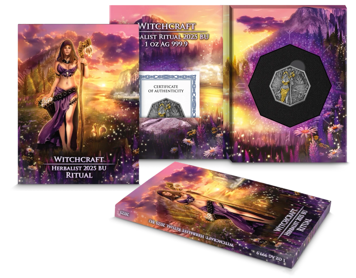 Witchcraft: Herbalist Ritual 1 uncja Srebra 2025 to druga odsłona niezwykłej serii Witchcraft. Kontynuuje kolekcję przedstawiającą wyjątkowe kobiety z germańskiej mitologii, obdarzone tajemną wiedzą i mocą. Zielarka strzegła pradawnych sekretów natury – rozpoznawała właściwości każdej rośliny i potrafiła tworzyć z nich lecznicze eliksiry oraz napary o magicznej sile.