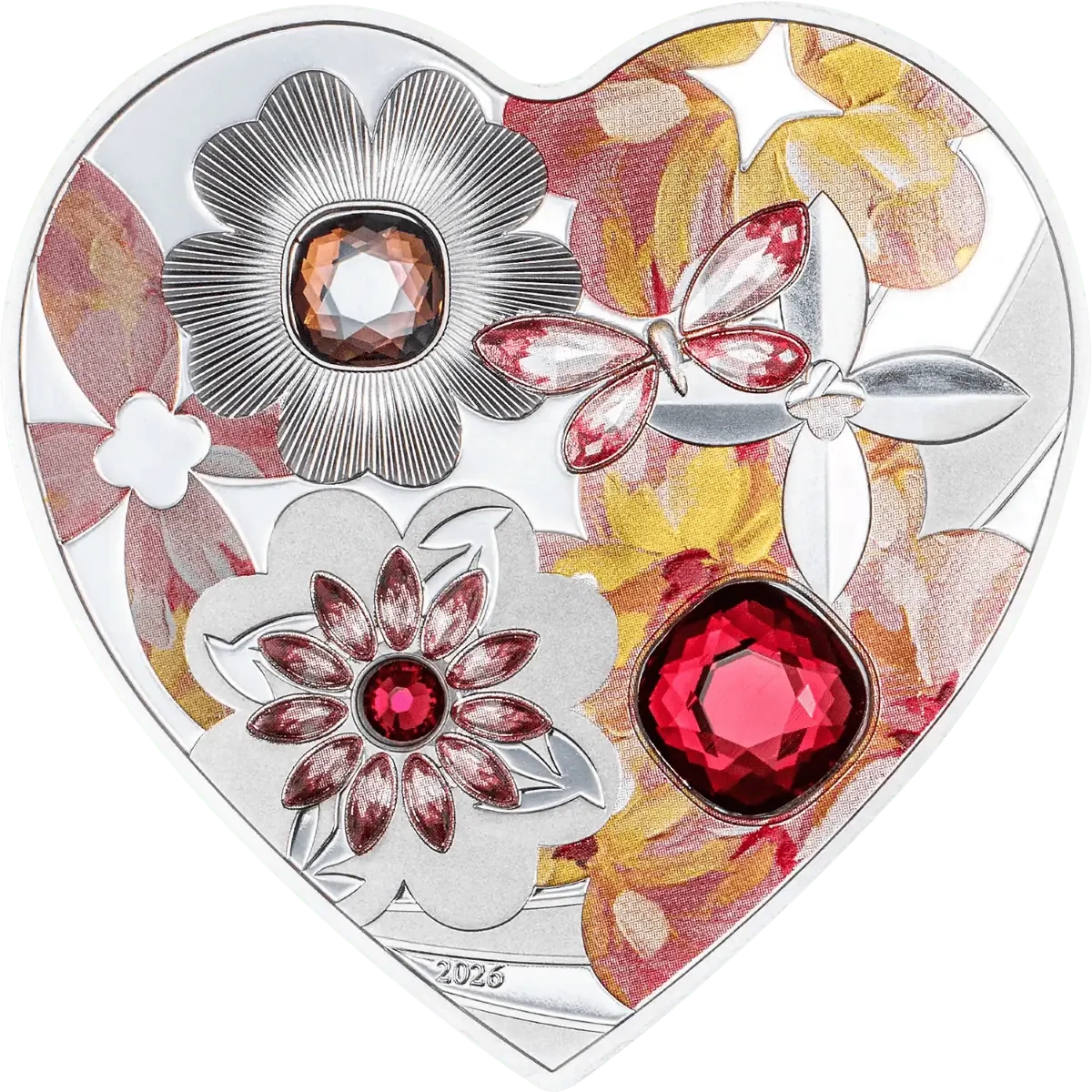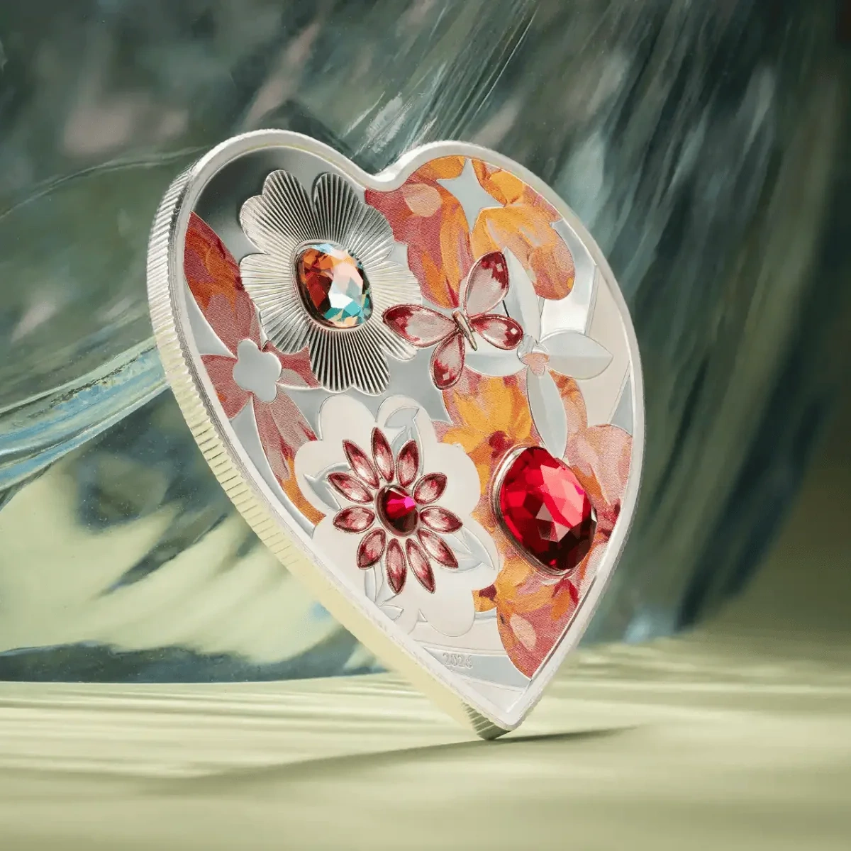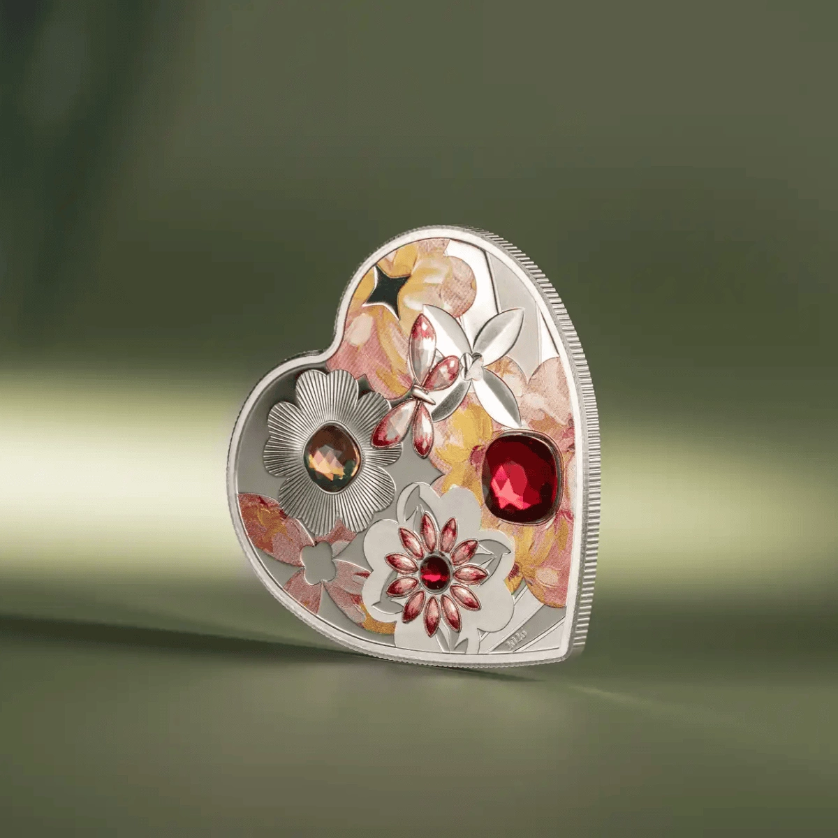 Cook Islands: Brilliant Love – Blossom kolorowany 20 gramów Srebra 2025 Crystal Proof to niepowtarzalna moneta w kształcie serca z romantycznej serii Silver Hearts, łącząca motywy miłości z mistrzowską jakością menniczą charakterystyczną dla emisji z Wysp Cooka. Została wybita z 20 gramów czystego srebra próby 9999 w standardzie Crystal Proof, urzekając elegancją i dopracowaniem detali, dzięki czemu stanowi idealny podarunek na najważniejsze, pełne emocji chwile.