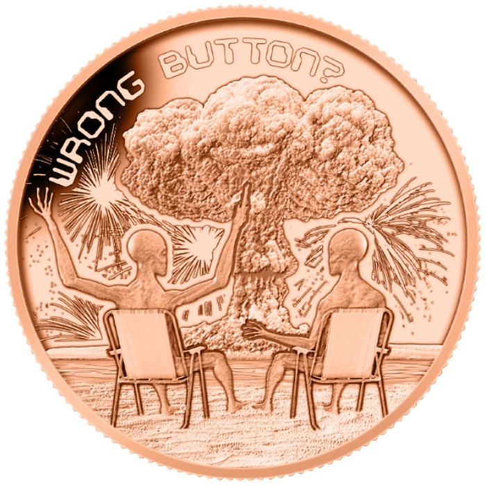 Awers: Ukazuje dwoje kosmitów siedzących na krzesłach, spoglądających w dal na potężny grzyb atomowy. Nad sceną umieszczono wymowny napis „WRONG BUTTON”, stanowiący humorystyczny komentarz do katastrofalnego wyniku ich eksperymentu.