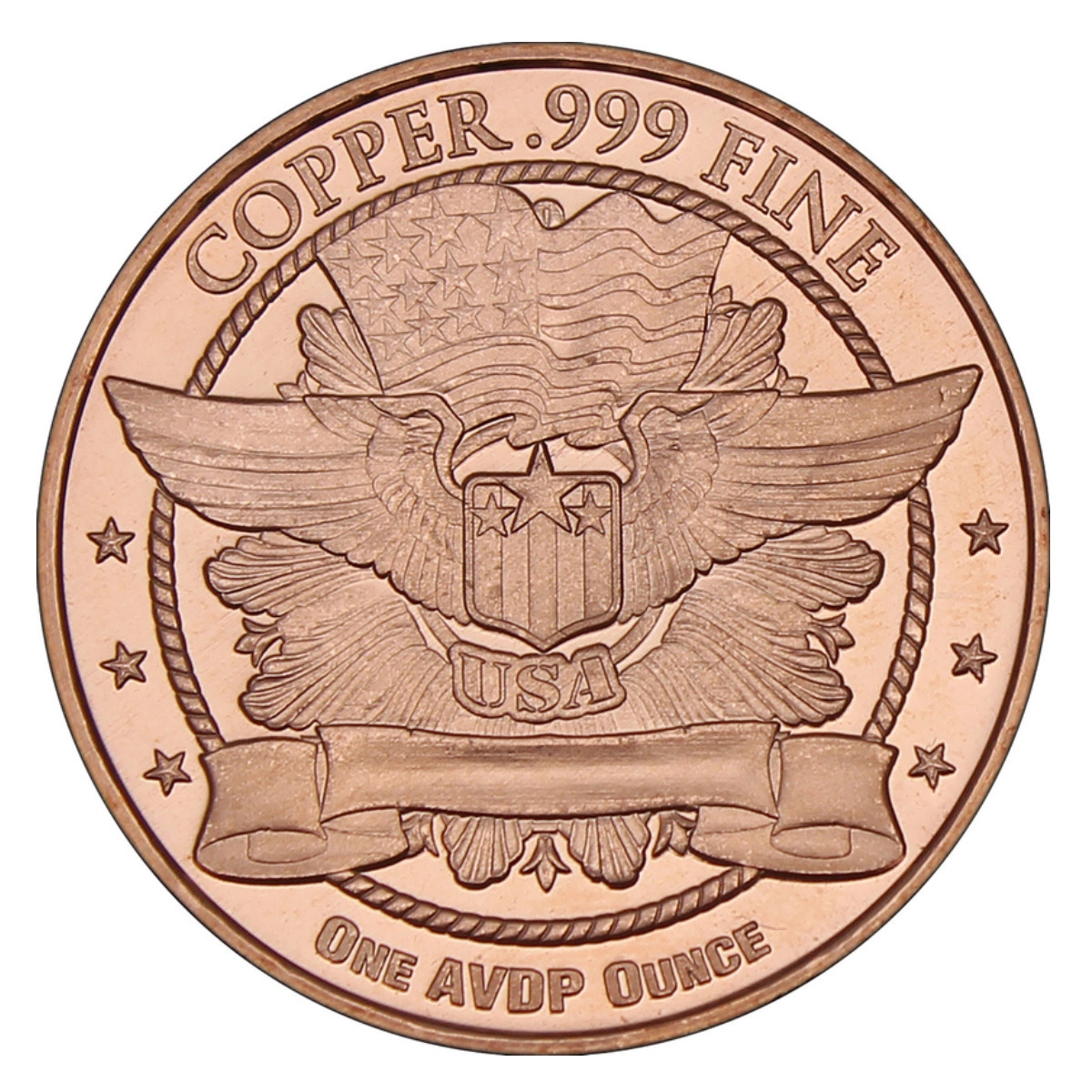 Rewers ukazuje zestaw symboli patriotycznych Stanów Zjednoczonych: centralnie widoczne są skrzydła i tarcza z pasami oraz gwiazdami, nawiązujące do godła prezydenckiego. Ponad tarczą odwzorowano w reliefie elementy flagi USA. W dolnej części rewersu znajdują się inskrypcje techniczne potwierdzające autentyczność i wagę: „COPPER .999 FINE” oraz „ONE AVDP OUNCE”, informujące o czystości kruszcu i nominalnej zawartości. Po lewej i prawej stronie umieszczono po trzy gwiazdy, symbolizujące patriotyzm i strukturę stanową Ameryki.