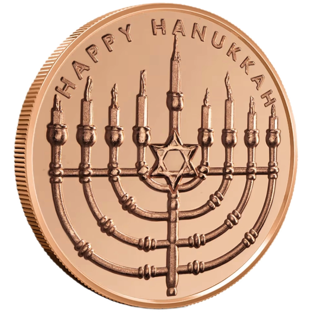 Awers: Przedstawia menorę z dziewięcioma świecami; centralna świeca, shamash, służy do zapalania pozostałych w trakcie kolejnych ośmiu dni święta. W centrum widnieje Gwiazda Dawida, a nad kompozycją umieszczono napis „HAPPY HANUKKAH”. Całość oddaje duchowy i tradycyjny wymiar święta.