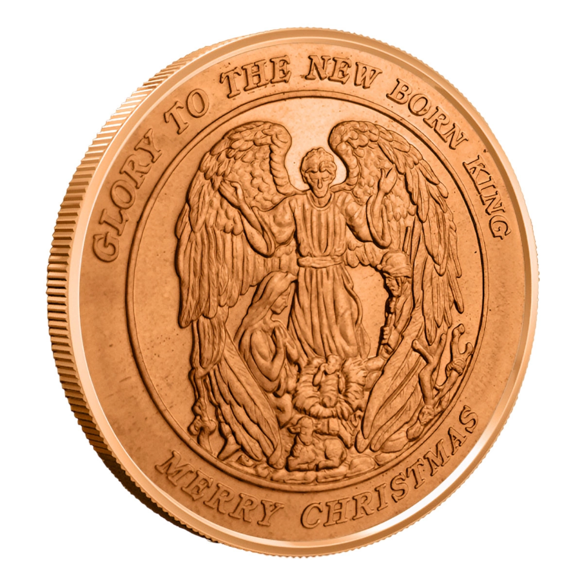 Nativity – Angel 1 uncja Miedzi to bożonarodzeniowy medal z 1 uncji czystej miedzi .999, ukazujący jedną z najpiękniejszych scen świątecznych. Na projekcie widoczna jest Święta Rodzina w betlejemskiej stajence, a całość dopełniają symbole: anioł unoszący się nad przedstawieniem oraz baranek klęczący przy żłóbku. To klimatyczny motyw czerpiący z tradycyjnej ikonografii Bożego Narodzenia.