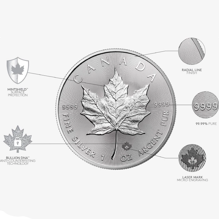 Royal Canadian Mint stosuje zaawansowane zabezpieczenia, dzięki czemu srebrny Liść Klonowy uchodzi za jedną z najbezpieczniejszych emisji inwestycyjnych. Od 2014 roku tło monety tworzą promieniste linie utrudniające fałszowanie, a w dolnej części rewersu umieszczono mikro‑grawerowany liść klonu widoczny pod powiększeniem. Rozwiązania te podkreślają najwyższą jakość i dbałość o detal, z których słynie kanadyjska mennica.