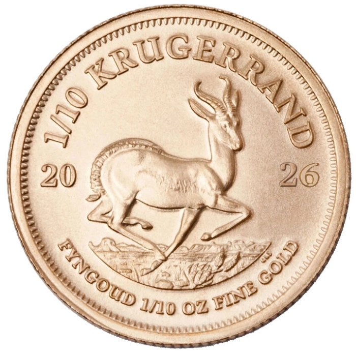 Rewers: przedstawia antylopę springbok – narodowy symbol RPA. Po obu stronach widnieją cyfry roku emisji 2026, a pod wizerunkiem zwierzęcia umieszczono napis „FYNGOUD 1/10 OZ FINE GOLD”, wskazujący ilość czystego złota w monecie. Klasyczna kompozycja pozostaje wierna charakterowi serii, podkreślając jej prestiż i wiarygodność inwestycyjną.