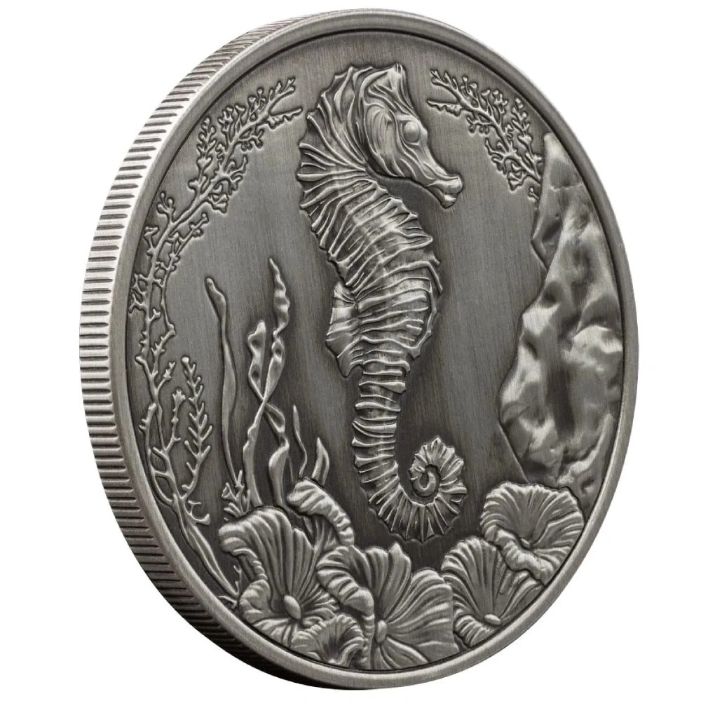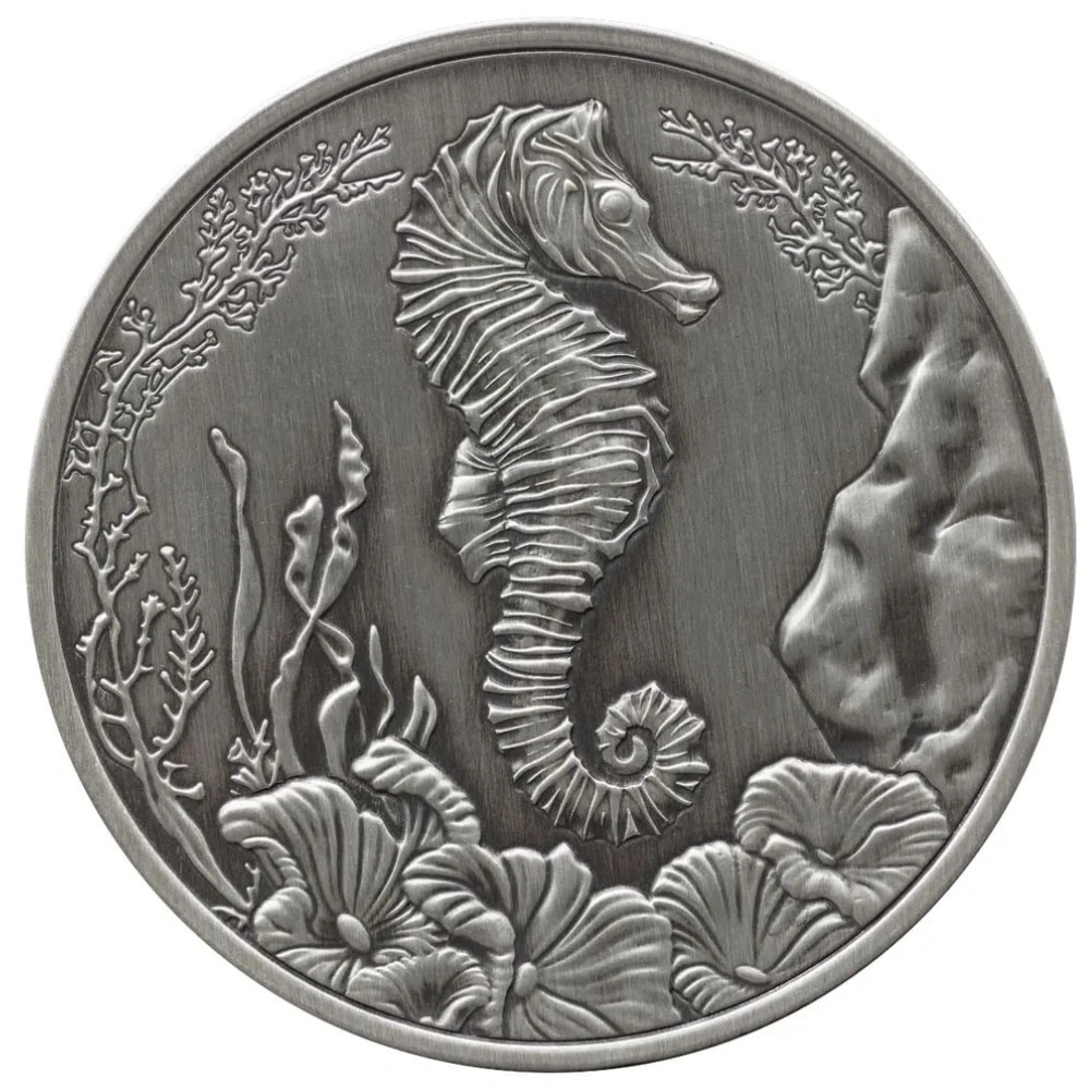 Samoa: Seahorse 1 uncja Srebra 2025 Antiqued to artystyczna edycja kolekcjonerska znanej serii z motywem konika morskiego, wybita z jednej uncji srebra o próbie .999. Wykończenie typu Antiqued nadaje monecie klasyczny, postarzały wygląd, inspirowany tradycyjną sztuką medalierską.