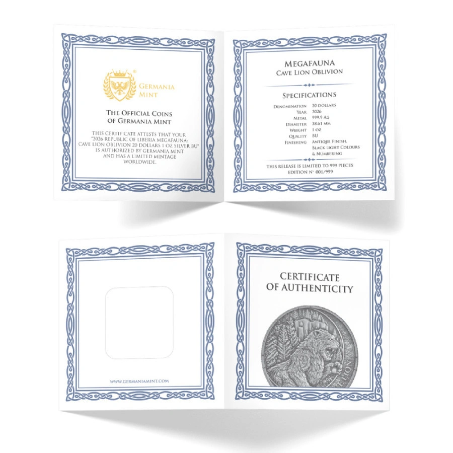 Germania Mint: Megafauna – Lew Jaskiniowy Oblivion to limitowana edycja srebrnej monety kolekcjonerskiej z 2026 roku, będąca częścią debiutanckiej serii Megafauna. Wariant Oblivion stanowi artystycznie przekształconą wersję klasycznej emisji, podkreślając mroczną symbolikę epoki lodowcowej i przemijającej potęgi natury.