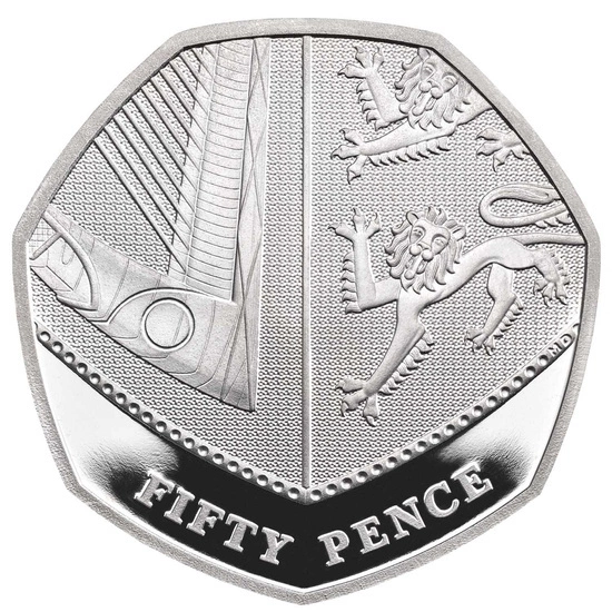 - 50p Base Proof, moneta posiada stop miedzionikiel, wagę 8 gramów, średnicę 27.30mm, nominał 50p.