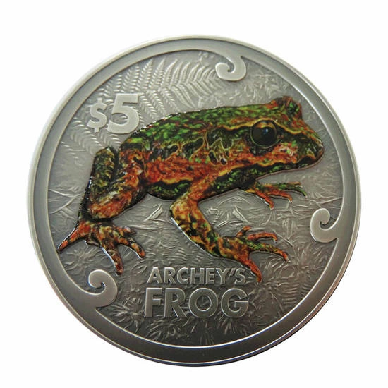 Limitowana moneta Żaba Archey's kolorowana 2 uncje Srebra 2022 Antique to egzemplarz, który ukazuje wymarłą już, endemiczną żabę, która zamieszkiwała Północną Nową Zelandię. Co ciekawe, nazwa płaza pochodzi od nazwiska Instytutu Auckland Sir'a Gilberta Archeya. Żaba osiągała maksymalną długość ciała do 37mm.