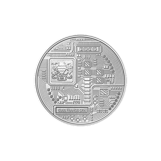 Srebrna, bulionowa moneta Czad: Bitcoin 1 uncja Srebra 2020 to egzemplarz prezentujący bitmonetę, która jest kryptowalutą wprowadzoną w 2009 roku przez Satoshi Nakamoto. Walor pochodzi z serii Chad Crypto.