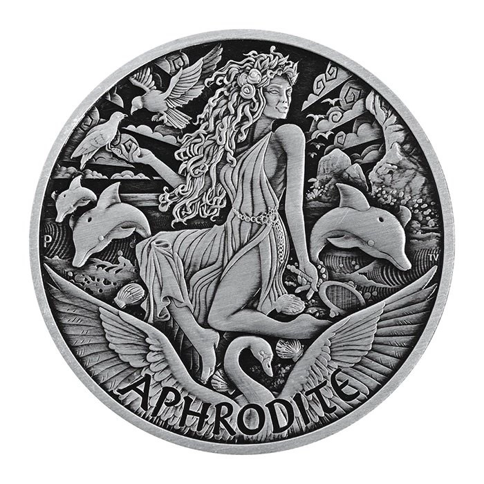 Srebrna moneta bulionowa przedstawiająca Afrodytę to produkt wykonany z czystego kruszcu próby Ag.9999, o wadze jednej uncji trojańskiej oraz średnicy 40,9 mm, w wersji antiqued. Moneta Afrodyta 2022 jest szóstym walorem z serii Bogowie Olimpu. Moneta ta posiada gwarancję rządu Tuvalu oraz stanowi pełnoprawny środek płatności na terenie tego kraju. Co ważne, jest to srebrny egzemplarz, który posiada ściśle limitowany nakład, liczący 1 500 sztuk. Warto zatem zainteresować się tą monetą, jak i całą serią.