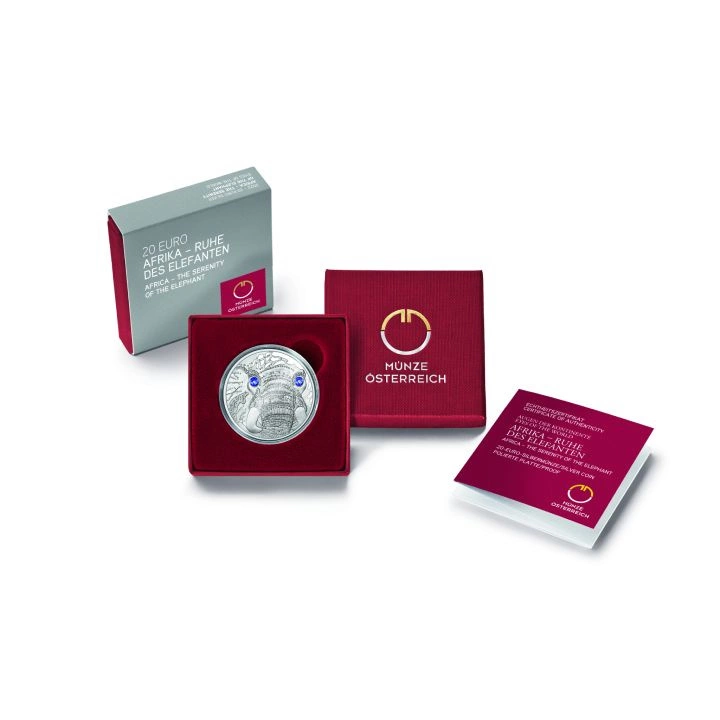 Moneta Africa - Serenity of the Elephant 20 Euro Srebro 2022 Proof to czwarty walor pochodzący z serii Eyes of the World, która będzie składać się z 5 egzemplarzy. Produkt ukazuje słonia afrykańskiego podziwianego za wyważoną postawę i kojące poczucie spokoju. Na rewersie znajduje się głowa słonia wraz z lśniącymi, pięknymi i szafirowo-niebieskimi oczami, które zostały wykonane z kryształów Swarovskiego®.