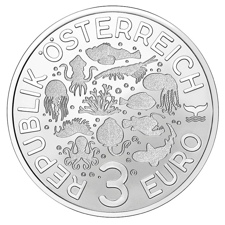 Awers ukazuje 12 morskich stworzeń, które wchodzą w skład serii "Luminous Marine Life". Na awersie, znajduje się także nominał monety oraz napis "REPUBLIK ÖSTERREICH".
