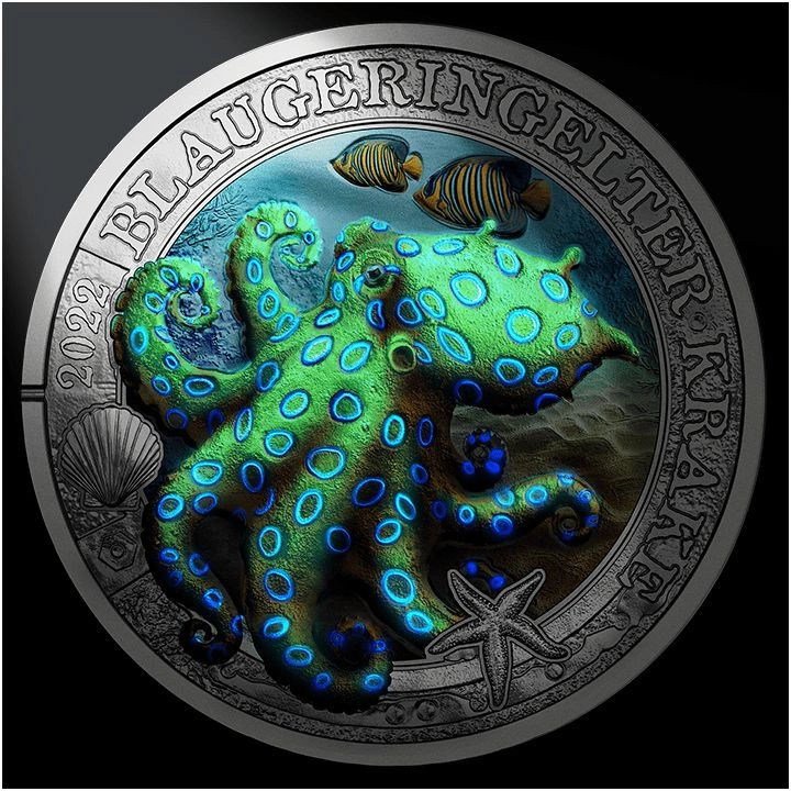 Blue-Ringed Octopus kolorowany 3 Euro Miedź 2022 to pierwszym produktem z serii "Luminous Marine Life", która będzie składać się z 12 monet.