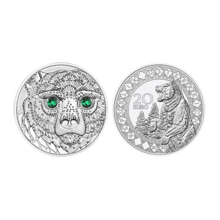 Na rewersie znajduje się głowa niedźwiedzia wraz z lśniącymi, pięknymi szmaragdowo-zielonymi oczami, które zostały wykonane z kryształów Swarovskiego®.
