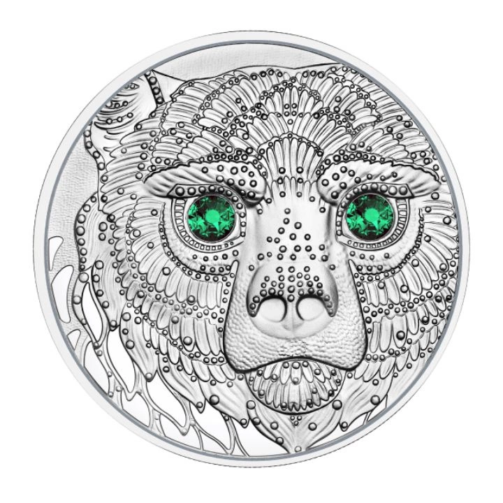 Rewers przedstawia głowę niedźwiedzia wraz ze szmaragdowo-zielonymi oczami, wykonanymi z kryształów Swarovskiego.