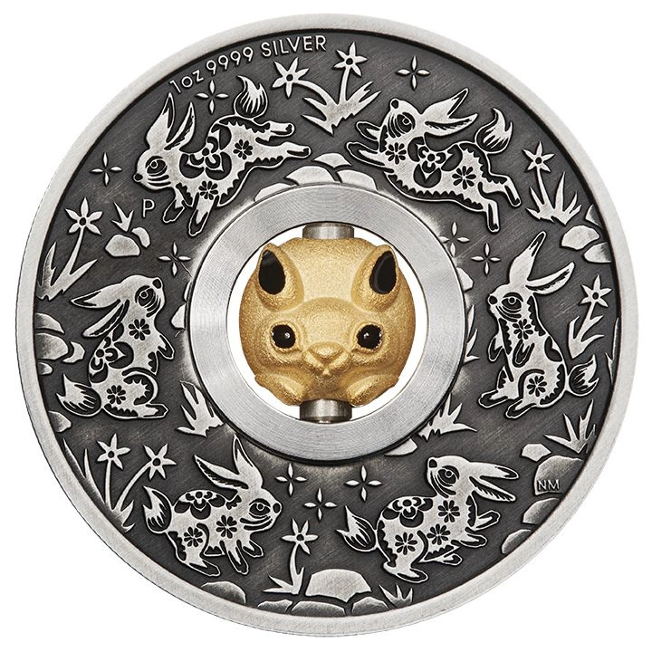 Srebrna moneta Tuvalu: Lunar III - Rok Królika 1 uncja Srebra 2023 Rotating Charm Antiqued Coin to wyjątkowa propozycja przygotowana przez australijską mennicę The Perth Mint. Wspomniana moneta jest komplementarnym elementem czwartego kolekcjonerskiego wydania serii Lunar III. Poprzednimi monetami z serii był Rok Myszy 2020, Rok Bawoła 2021 oraz Rok Tygrysa 2022. Księżycowa seria nawiązuje do 12 zwierząt, które są przedstawicielami chińskiego kalendarza lunarnego. Rok 2023 należy do królika, inaczej nazywanego kotem. Chiński znak zodiaku królik przypada w latach 1951, 1963, 1975, 1987, 1999, 2011, 2023.